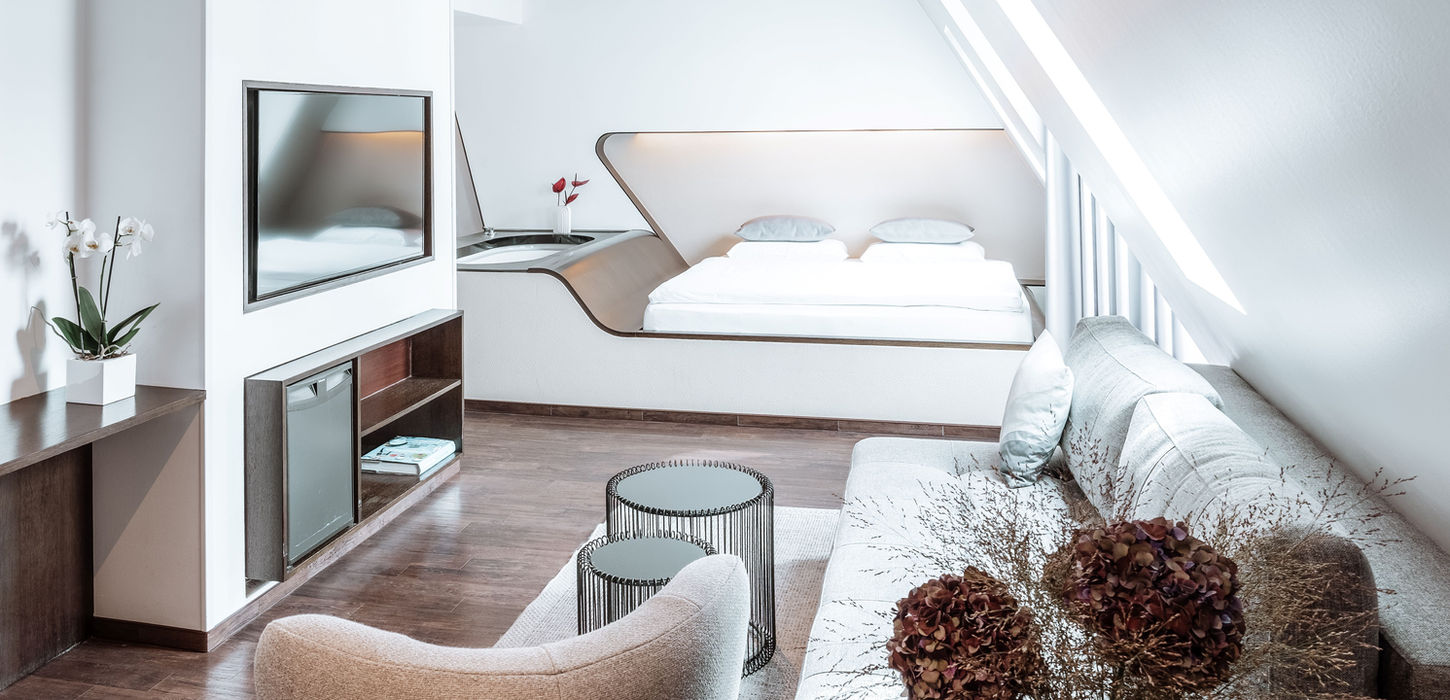 This beautiful penthouse suite offers a luxurious interior. On 60 square meters you will find a 200 x 200 cm king size bed, a bathroom with two washbasins, a shower and a bathtub. A balcony and a large sitting area with flat screen TV and safe offer plenty of comfort.
